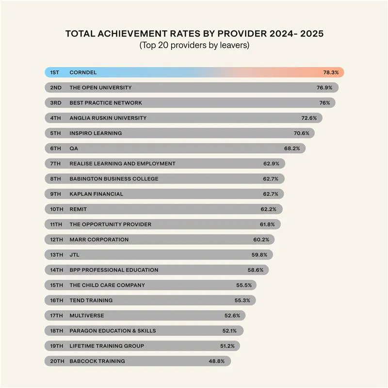 Corndel achieved 78.3% - the highest of any large provider in England, sitting 13 percentage points above the national average. Corndel continues to redefine the benchmark for success - increasing a further 3.4% points on last year’s leading result.